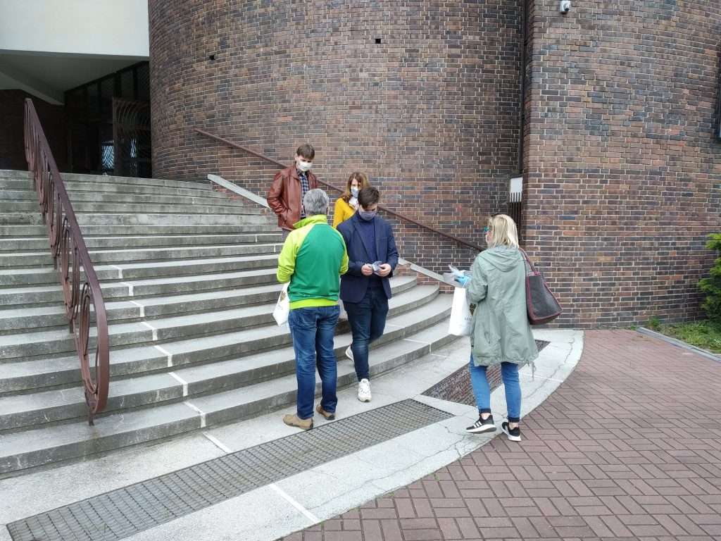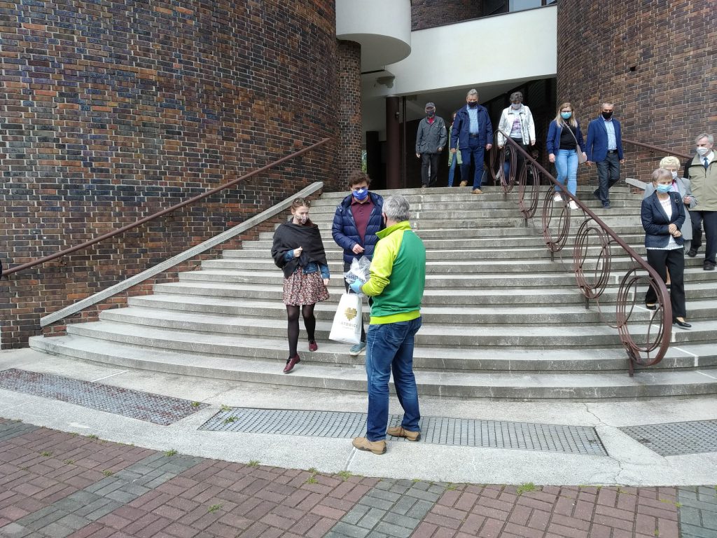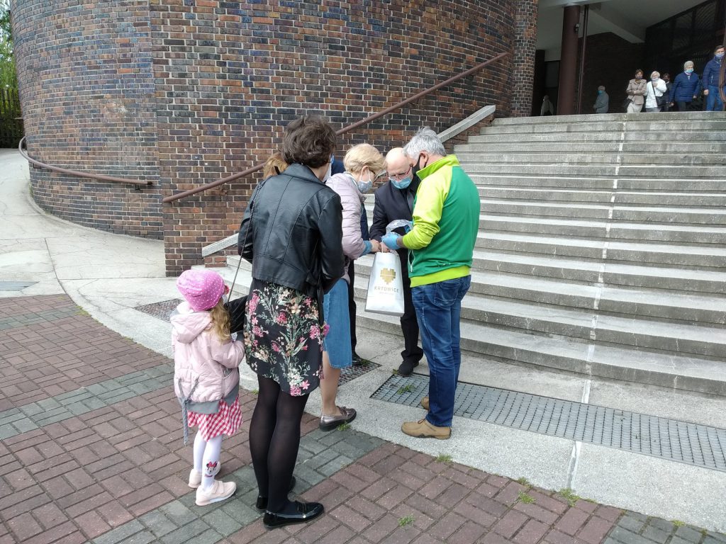 W niedzielę, 17 maja 2020 roku kolejny raz rozdawaliśmy maseczki ochronne uszyte przez dzielnych Mieszkańców Osiedla dla Mieszkańców Osiedla. Maseczki rozdawaliśmy na Osiedlu Dolnym przed Kościołem po porannych mszach.